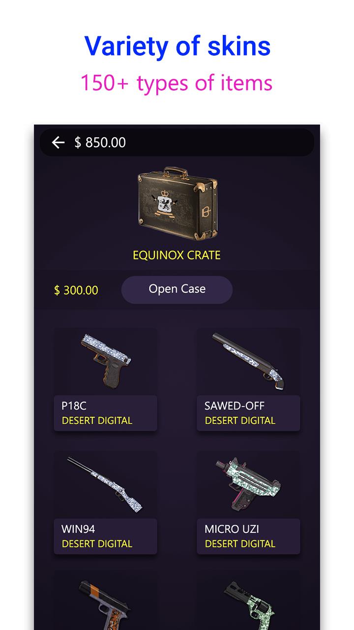 您必须已经在手机上玩过大逃杀游戏,并且使用不同皮肤玩游戏会带来很多变化。 通常,通过打开板条箱/盒子,我们可以在游戏中解锁新的皮肤,但是碰巧我们没有得到我们喜欢的皮肤。 该游戏是大逃杀游戏的案例模拟器,您将在其中获得各种皮肤的各种案例。在这里,您可以解锁自己喜欢但未进入游戏的皮肤。 在此案例模拟器中,有8种类型的案例和150种大逃杀游戏项目。