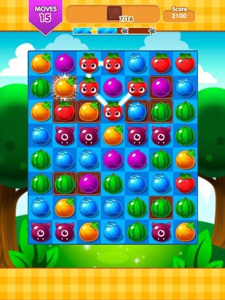 在相同颜色的水果上滑动即可破坏它们。在每个级别上执行任务。 最初,您有5条生活。如果您没有通过某个级别并返回主菜单,则将失去一命。如果您无法完成关卡,则可以再获得5个动作,然后尝试再次玩关卡。还有一个有时间限制的游戏模式。 对于每个完成的级别,您都可以赚取积分和奖金。游戏中有6种关卡目标,100个关卡和排行榜。如果您用尽了所有生命,只需在游戏中保持开启状态7分钟即可获得新生命。您可以在左上方的计时器上看到剩余时间。