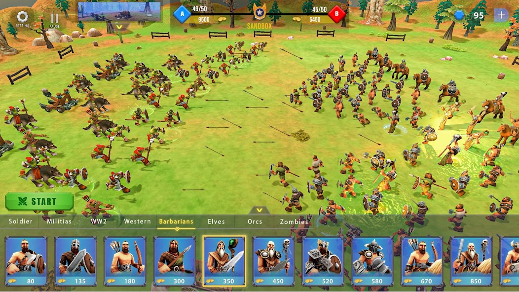 在战斗模拟器策略游戏中,在不同的竞技场沙漠、森林和山脉中进行战斗。