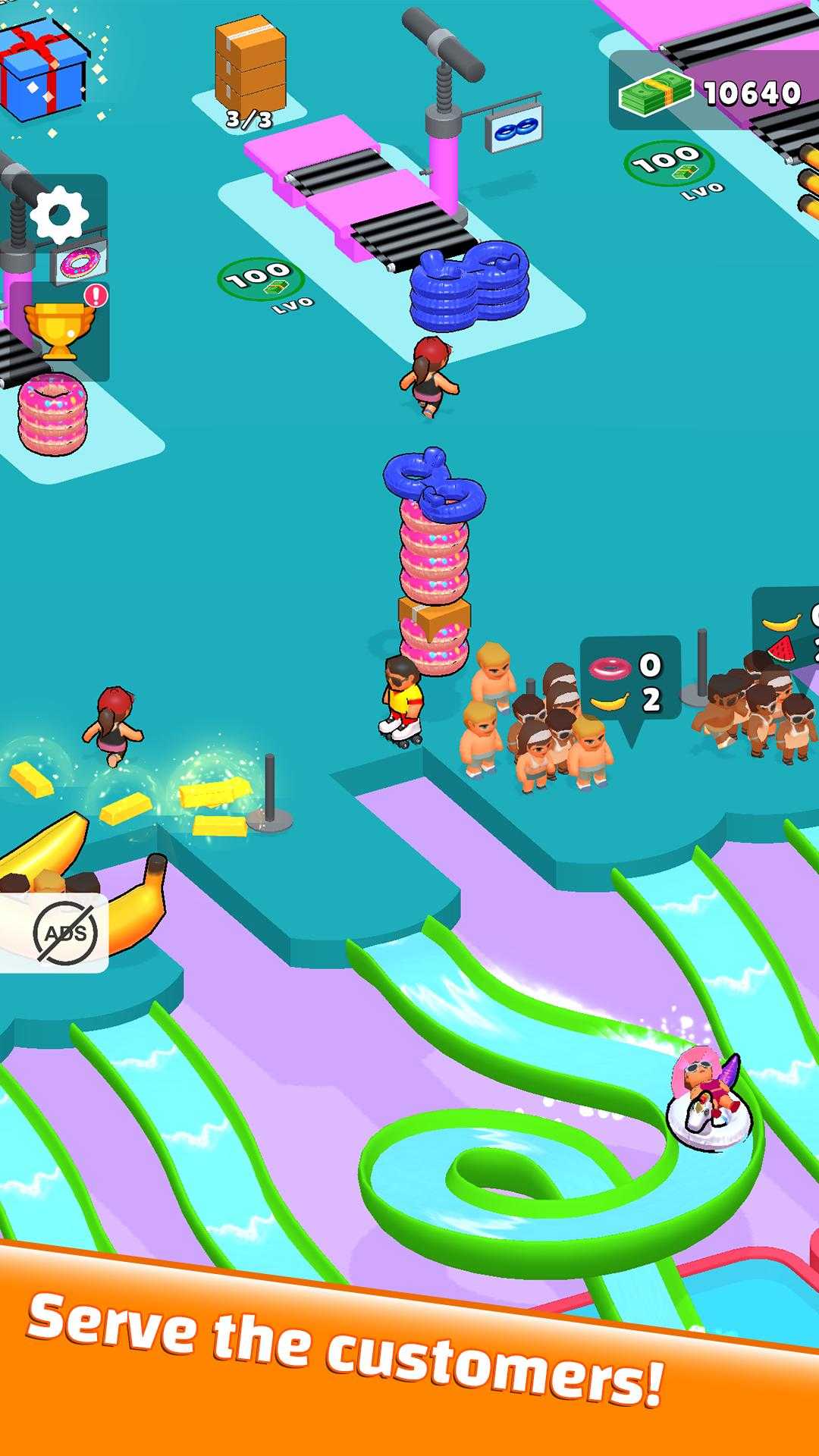 建造你梦想中的水上乐园,为你的顾客服务,让他们玩得开心! 好好努力!制作滑梯,给你的彩车打气!赚钱并雇佣新员工来优化你的水上乐园!