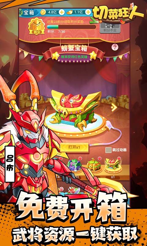 《切菜狂人(1折免费版)》是一款Q版拟人画风的休闲放置挂机游戏,玩家在游戏中扮演一位绝世食神,通过指挥蔬菜大军与怪物作战,培养成为一个顶尖食神。游戏提供了多种多样的蔬菜角色供玩家选择,并允许玩家自由搭配组合,打造一个独特的蔬菜世界。游戏的主要活动包括招募狂欢、装备狂欢和战宠狂欢,这些活动分为不同的阶段,每个阶段都有其特定的目标和奖励。