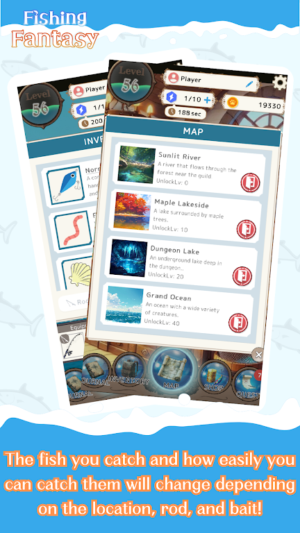 钓鱼幻想拥有直观简单的操作方式,适合所有类型的玩家。你只需选择理想的钓鱼位置、钓鱼竿及鱼饵,待浮标下沉时点击按钮便可开始钓鱼。当你体验到鱼在水中挣扎的快感时,战斗也就随之展开。对于大鱼而言,你需要不断点击屏幕,才能把它成功拉上岸。倘若遇到困难,别忘记通过升级你的钓鱼竿,提升捕捉成功的几率。每个玩家都能在游戏中找到属于自己的策略和节奏。
