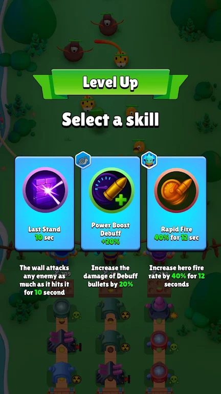 在每轮战斗中,您可以选择多种临时能量提升,这些提升能够显著增强英雄的伤害、子弹速度或炮塔生产率。合理运用这些提升,将能有效增强您的攻击力,将敌人一举击溃。将能源提升和合并策略结合,您将收获意想不到的战果。