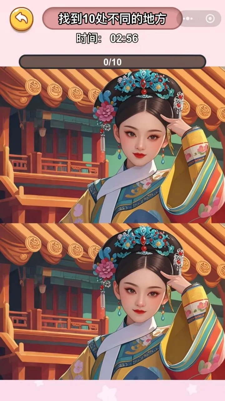 玩家在每一关中都会看到两幅古装美女的图片,细节上虽然相似,但实际上却隐藏着不少细微的差异。通过多次点击和仔细观察,玩家需要在限定时间内找出所有不同之处。每找到一个差异,玩家都能获得积分,积分可用于提升自己的游戏等级和解锁更多的游戏内容。