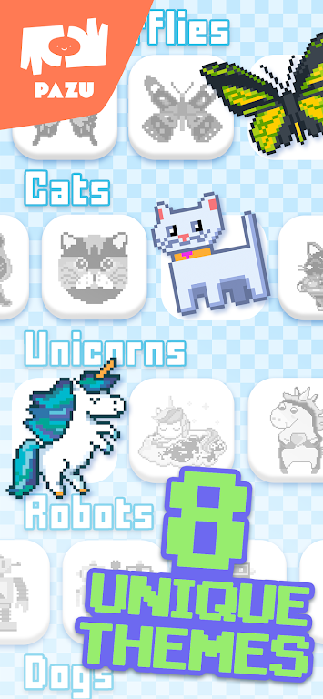 儿童像素艺术涂色本是一款专为6到10岁孩子设计的创意游戏,由Pazu Games Ltd公司倾力推出。这款游戏结合了像素艺术和涂色,旨在为儿童提供一个既有趣又富有教育意义的体验。游戏中的每一幅像素艺术作品都经过精心设计,能够吸引孩子们的注意力,激发他们的创造力与想象力。