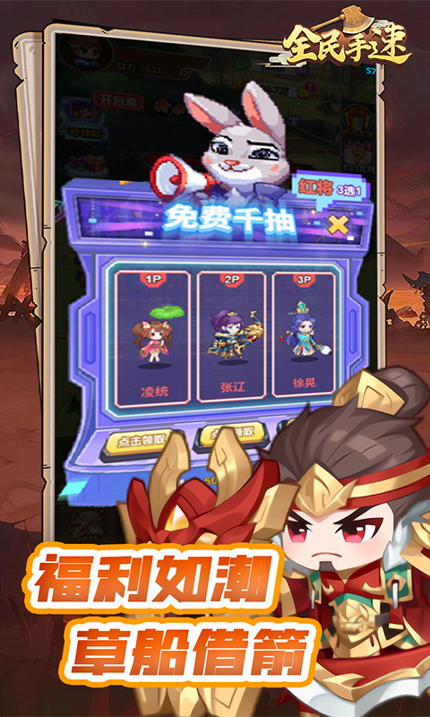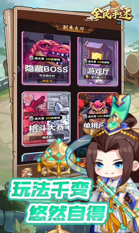 全民手速(内置0.1折免费版)是一款街机风挂机策略手游,玩家将在街头召集像素英雄与恶霸们一决高下。游戏内将关羽、诸葛亮、孙权、等多类型三国英雄聚集,玩家可根据英雄特点打造专属阵容,如急速推图流、boss高伤流、雷系爆发流等流派,主宰每一关的胜利。游戏还设有挂机系统,可解放玩家双手,坐等自动推图闯关,领取海量挂机奖励。