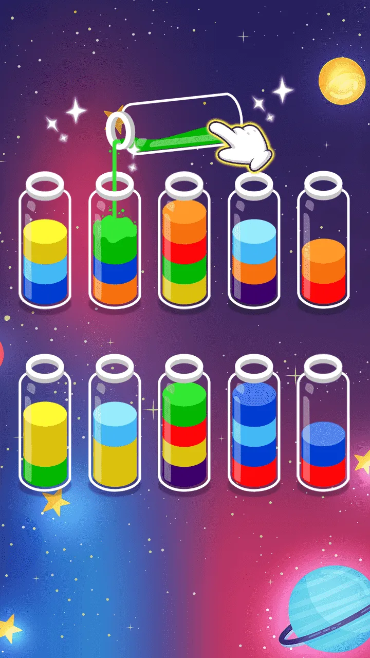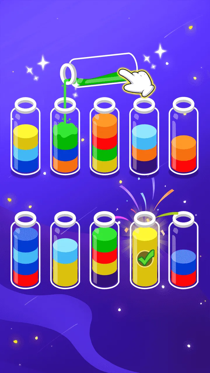 在难不倒你吧中,玩家会遇到多个瓶子,内含不同颜色的液体。每个瓶子内的颜色组合和数量都不尽相同,玩家的任务是将这些液体重新排序,使得每个瓶子都只包含同一种颜色。操作非常简单,点击选择一个瓶子后,再选择另一个瓶子,便可以将液体倒入目标瓶中。但在这个过程中,需要注意瓶子的容量,确保不会出现溢出的情况。