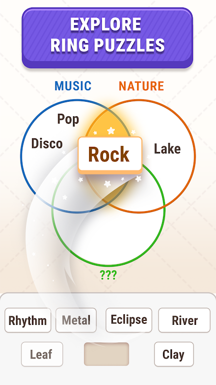 游戏采用精致的视觉设计,巧妙地将意义与美感结合在一起。当你将单词放入环中时,视觉元素与逻辑关系相互交融,形成一种独特的沉浸体验。每个关卡都有其独特的谜题设置,精致的界面不仅提高了用户体验,同时也让每个成功的联想更加令人满意。