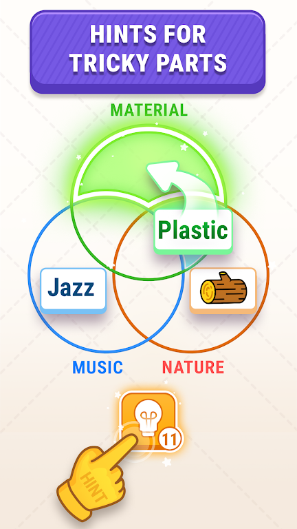 面对有挑战性的谜题时,你会发现它们不仅简单明了,有时甚至会出乎意料。每个关卡可能会呈现多个环、重叠的区域,甚至意想不到的类别组合,考验着你的创新思维和反应能力。无论是想要享受轻松的放松时光,还是准备全神贯注于思考,游戏都能为你提供合适的体验,不断激发你的智能潜力。
