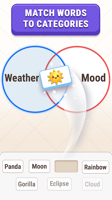 《词汇环:逻辑关联》的核心玩法与众不同,每个单词都被赋予生命般的意义。玩家需要将单词拖动到恰当的环中,这个过程中,你不仅要运用逻辑推理,还要依靠直觉来识别词汇之间的联系。与传统文字游戏不同,此游戏强调的是词汇的层次与关联,而不仅仅是单一的字面意义。