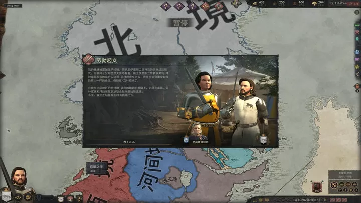 本Mod设计了多个高度还原的剧本,涵盖了从铁王座争夺到王权更迭的关键历史事件。例如“九铜板王之战”剧本,玩家将置身于紧张的第五次黑火叛乱,体验东方九人团崛起的威胁与马里斯的铁血雄心。与此同时,你还必须提防伊耿五世梦境中诡异的龙火降临,揭开那个远古王朝沉睡的危机。另一经典剧本“劳勃起义”则聚焦于「疯王」伊里斯·坦格利安二世与劳勃·拜拉席恩之间肆虐七国的反叛战争,种下权力更迭的种子。以及“加冕的雄鹿”剧本,讲述劳勃·拜拉席恩称王后的挑战与和平重建,这些故事丰富了玩家的游戏体验。