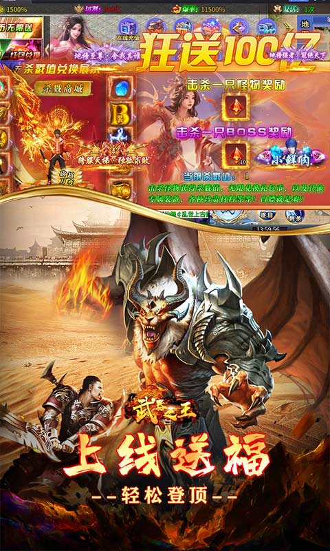 上线就送超级冠名,全屏拾取,自动回收,千倍爆率,首充大礼等等超绝豪礼!新超变,新玩法,不同体验,绝对带感!操作简单,玩法多样,直购币更是爆满地!散人好混,属性平衡,超多BUFF,时间就是一切!超级副本,超强神力,亿万攻击,亿万血量带你体验极致的数值体验!