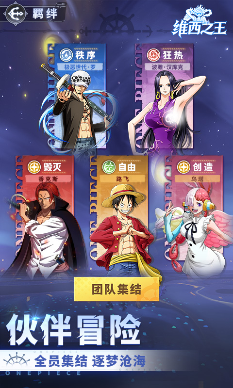 《维西之王》热血启航!登顶伟大航路,争霸海域霸权,解锁深海秘宝,圆梦你的航海王梦想!告别冗长养成、繁琐肝度,指尖轻点,即刻奔赴热血航海征程!集结草帽团经典羁绊,探索未知海域传说,携手忠心伙伴闯风暴、战强敌,解锁航海世界无限精彩!