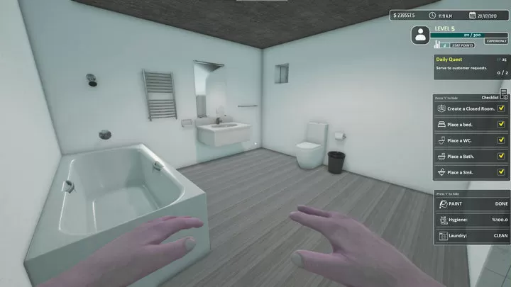酒店老板模拟器是一款酒店管理游戏,你将从一家小酒店起步,通过创造精美设计的房间、调整房间大小和布局(每面墙都由你来放置)、谈判高价以及扩展你的帝国来发展业务。让我们一起建造并管理度假村。