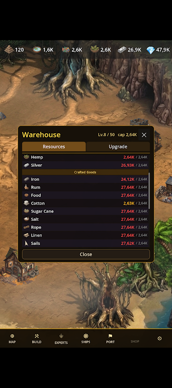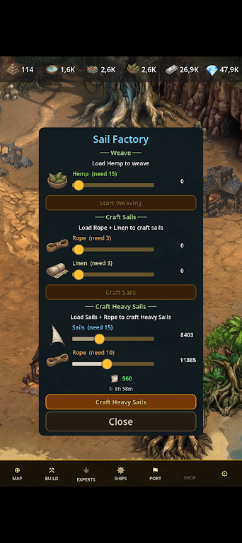 比如朗姆酒作为港口贸易的重要商品,不仅能用于交换珍稀物资,还能提升士气和英雄的忠诚度。大炮和火药则是军事力量的保障,保障舰队在海上对抗敌人的优势。船帆的质量影响航速和机动性,良好的航海装备决定远航成功率和资源采集效率。