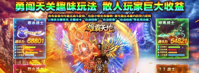 2、丰厚“新手福利”:立即加入,即可获得"自动捡物”、“自动范用拾取”、"自动回收”、“自动吃经验”、“自动吃元宝”、“自动挂机"等实用功能,让你的起步更加轻松!