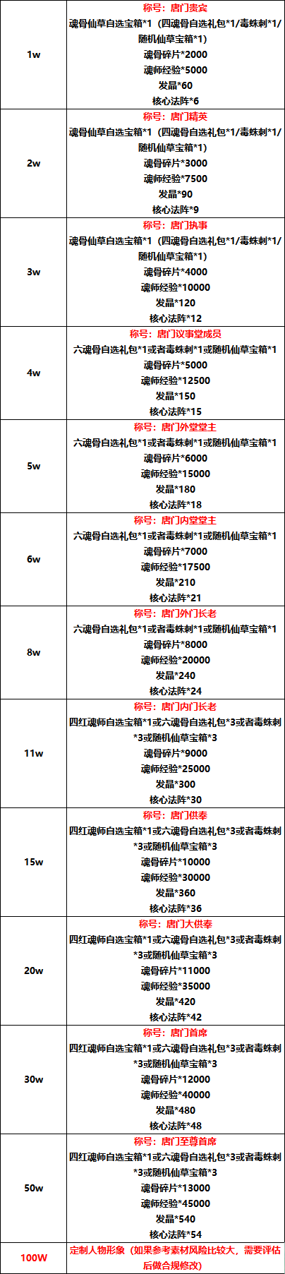 玩家在活动期间内累计充值达到以下金额(折扣前),即可联系客服申请领取对应档位礼包奖励