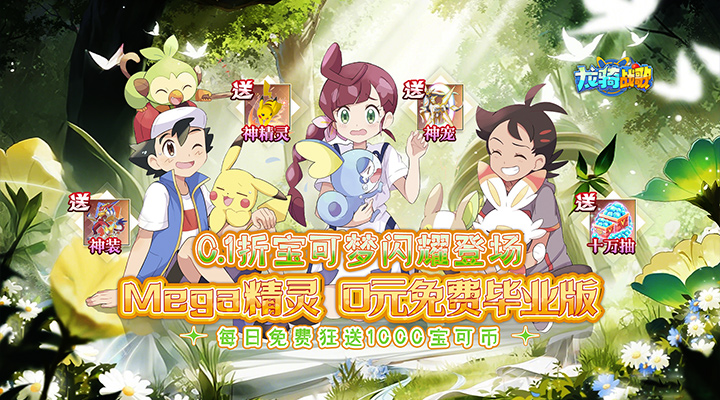《龙骑战歌》0.1折免费毕业版,免费豪送十万抽!版本毕业精灵每日免费抽,超千真充宝可币每日免费领!众多宝可梦精灵组合及绚丽的技能,让玩家能融入到幻想世界中增加游戏和战斗的沉浸感,Mega进化,精灵突破Mega形态,解锁全新技能!在全新的地点,遇见全新的伙伴。朝着梦想与冒险的宝可梦世界Let'sGo!
