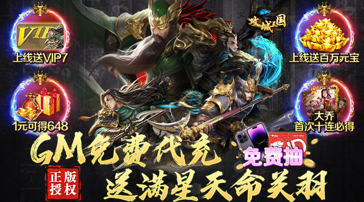 《攻城三国》正版授权BT福利版来啦,游戏上线即送VIP7、100w元宝、1000w铜钱、10000GM点,V7超强武将【吕布】直接获取!GM修改器免费充,零氪也能充值元宝升级VIP,还有战令活动免费激活领取,更有资源破解免费获得铜钱、粮草、元宝!战令+天命武圣活动再送满星天命关羽,还有无双张角、无双曹操、无双刘禅等海量名将免费等你来拿,攻城略地一路轻松秒秒秒!游戏特有的战中策略模式,摒弃了纯数据比拼,让战斗变得更加刺激有趣。玩家可以在游戏中收集诸多三国名将进行培养,并率领麾下大军参与国战,攻城略地,在乱世中建立属于自己的势力。名将养成、实时国战、经典战役、争夺皇位 ,精彩尽在攻城三国! 变态福利