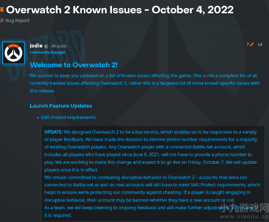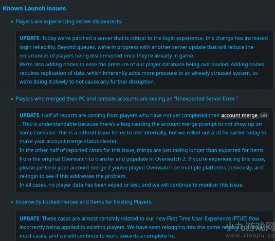 暴雪从昨天晚上深夜的游戏总监Aaron Keller的微博中表示,该小组“在服务器问题及稳定性上稳步前进”后,就再也没提供过更新的破解游戏消息。开发人员说,“已知问题”页会在解决问题时被更新。这份清单目前包含了从合并后PC与主机帐户之间“意外服务器错误”,饰品与货币缺失,服务器中断等问题。