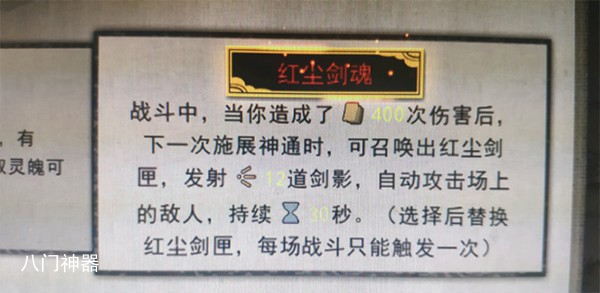 1、战斗中,当你造成了400次伤害后,下一次施展神通时,可召唤出红尘剑匣,发射后12道剑影,自动攻击场上的敌人,持续又30秒(选择后替换红尘剑匣,每场战斗只能触发一次)
